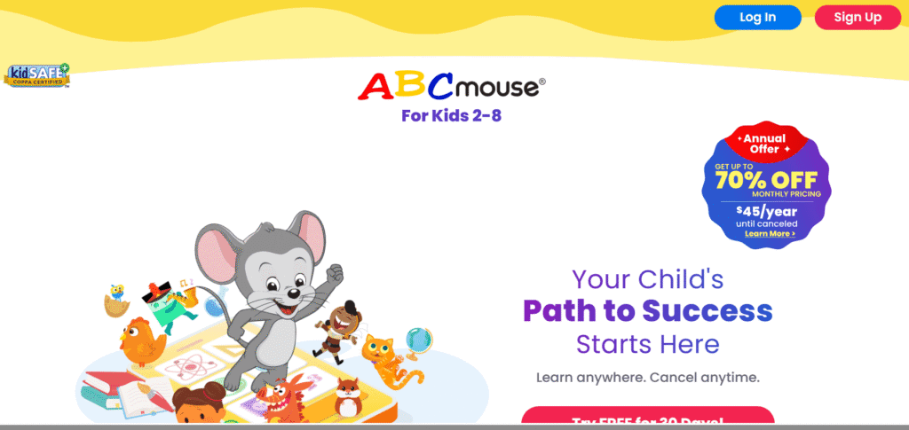 ABCmouse offers over 10,000 learning activities across subjects. Kids follow a personalized learning path with lessons that get progressively harder. Parents can track progress, and kids earn tickets to buy virtual rewards like pets and room decorations.